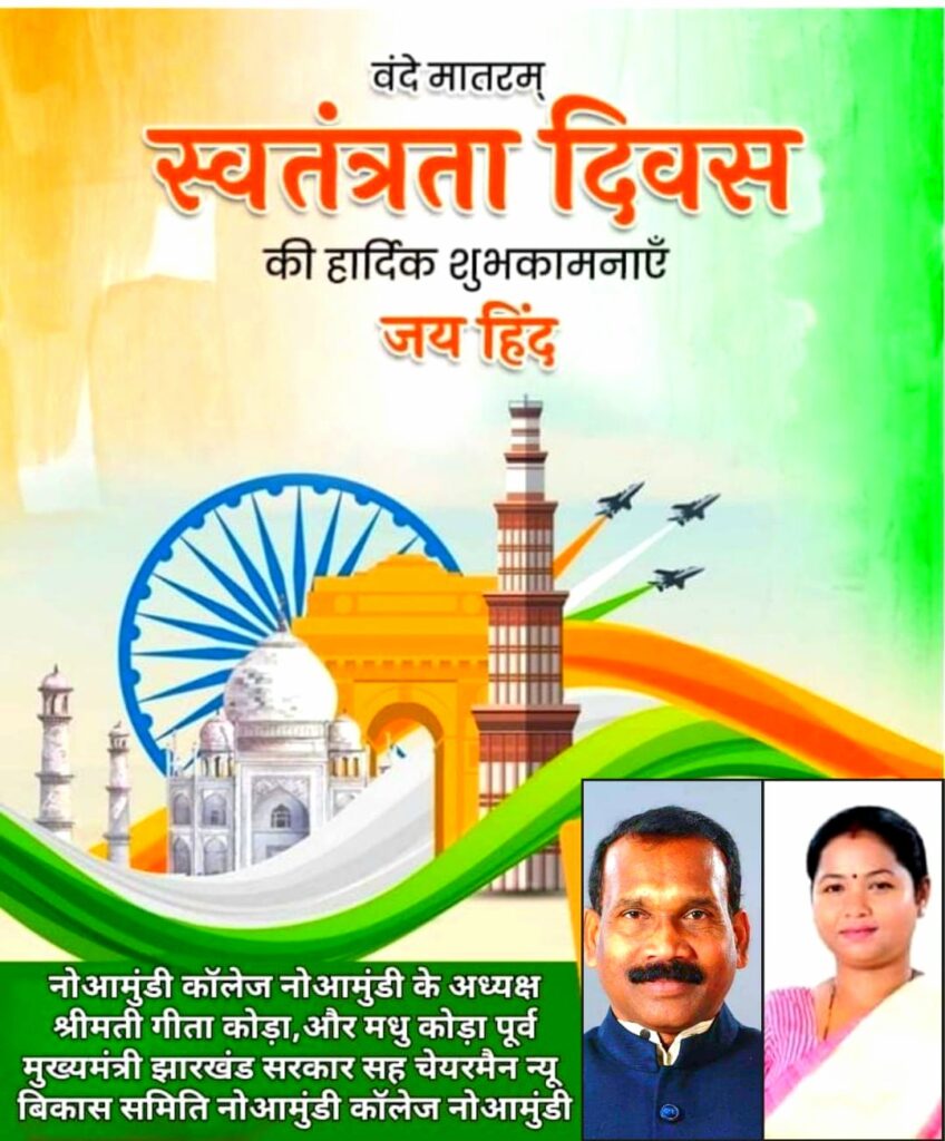 नोआमूंडी में काफी हर्ष उल्लास के साथ 78 वां स्वतंत्रता दिवस मनाया गया।इस अवसर पर पूरे प्रखण्ड कार्यालय को रंग बिरंगे फूलों और झालरों से सजाया गया था। प्रखण्ड प्रमुख पूनम गिलुवा ने प्रखंड सह अंचल कार्यालय में झंडोतोलन किया ।इस अवसर पर प्रखंड कार्यालय में छोटे बच्चो की काफी भीड़ थी कार्यक्रम में मुख्य रूप से प्रखण्ड प्रमुख पूनम गिलुवा, सीओ मनोज कुमार, बीडीओ अनुज बांडों, प्रखण्ड कल्याण पदाधिकारी रवींद्र कुमार सिंह देव, अनुसेवी सरस्वती देवी मौजूद रहे।वही महुदी पंचायत कर्यालय में मुखिया लक्ष्मी देवी ने झंडोतोलन किया और देश वासियों को स्वतंत्रता दिवस की हार्दिक शुभकामनाए दी। इस दौरान महुदी पंचायत में लोगों की काफी भीड़ दी।