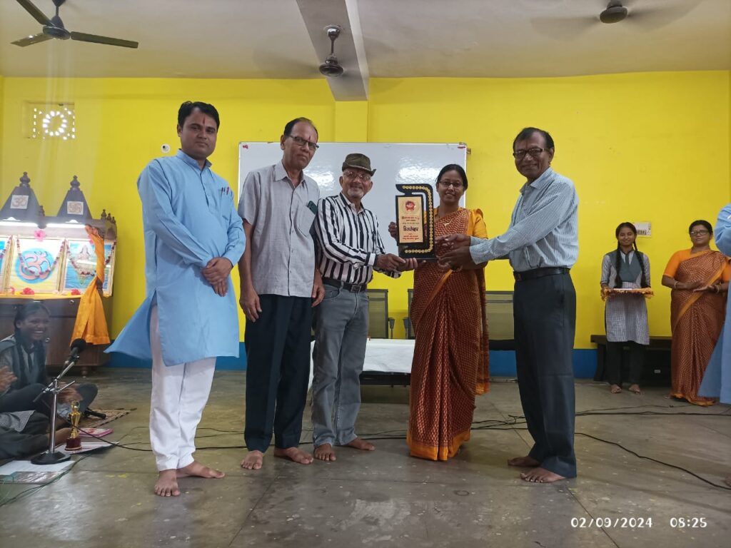 आज दिनांक : 02/09/2024, सोमवार को ‘तुलसी भवन, बिस्टूपुर’ में ‘तुलसी जयंती’ के अवसर पर आयोजित प्रतियोगिताओं में विजेता भैया/बहनों को वंदना स्थल पर पुरस्कार देकर सम्मानित किया गया। कार्यक्रम का शुभारंभ अतिथि शिवनंदन कुमार एवं हरिहर राय चौहान (साहित्यकार, तुलसी भवन), अजय प्रजापति (विद्यालय समिति सदस्य एवं सह साहित्यकार तुलसी भवन) एवं प्रधानाचार्य अभिलाष गिरी ने वंदना स्थल पर दीप प्रज्वलन एवं पुष्पार्जन कर किया। वंदना के पश्चात प्रतिभागियों को सम्मानित किया गया। ‘माता शबरी रूप सज्जा’ में कक्षा चतुर्थ ‘अ’ की बहन संचिता नायक, ‘श्री हनुमान चालीसा पाठ ‘ में कक्षा तृतीय ‘ब’ के भैया राजवीर पासवान, ‘निबंध प्रतियोगिता’ में कक्षा नवम ‘अ’ की बहन यामिनी कुमारी को सम्मानित किया गया। इसके अतिरिक्त ‘अनपति देवी स. शि. वि. मं. फुसरो’ विद्यालय में 31 से 1 सितम्बर को आयोजित ‘प्रांतीय संस्कृति महोत्सव’ में अपने विद्यालय से अंग्रेजी की आचार्या रिंकू दीदी ने पत्र वाचन में भाग लिया था, उन्हें भी ‘विजयोपहार’ से सम्मानित किया गया। आगंतुक अतिथियों ने भैया/बहनों का मार्गदर्शन किया और अपने धर्म एवं संस्कृत का सम्मान करने को कहा।