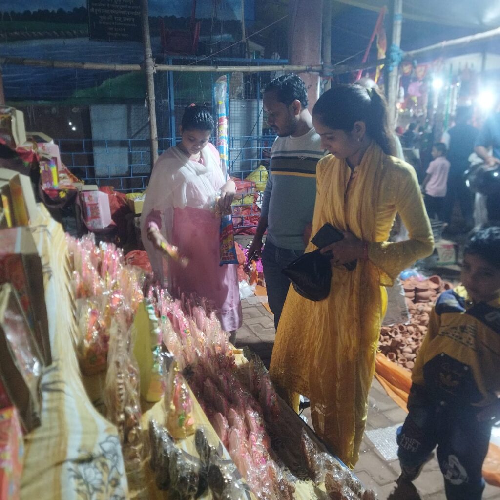 पटाखा की दुकानें लगी है ।बाजार के अंदर दुर्गा पूजा पंडाल के सामने कुम्हार के द्वारा दीप,कलश,मिटी के घरौंदे,बच्चो के खिलोने की दुकानें लगाई गई