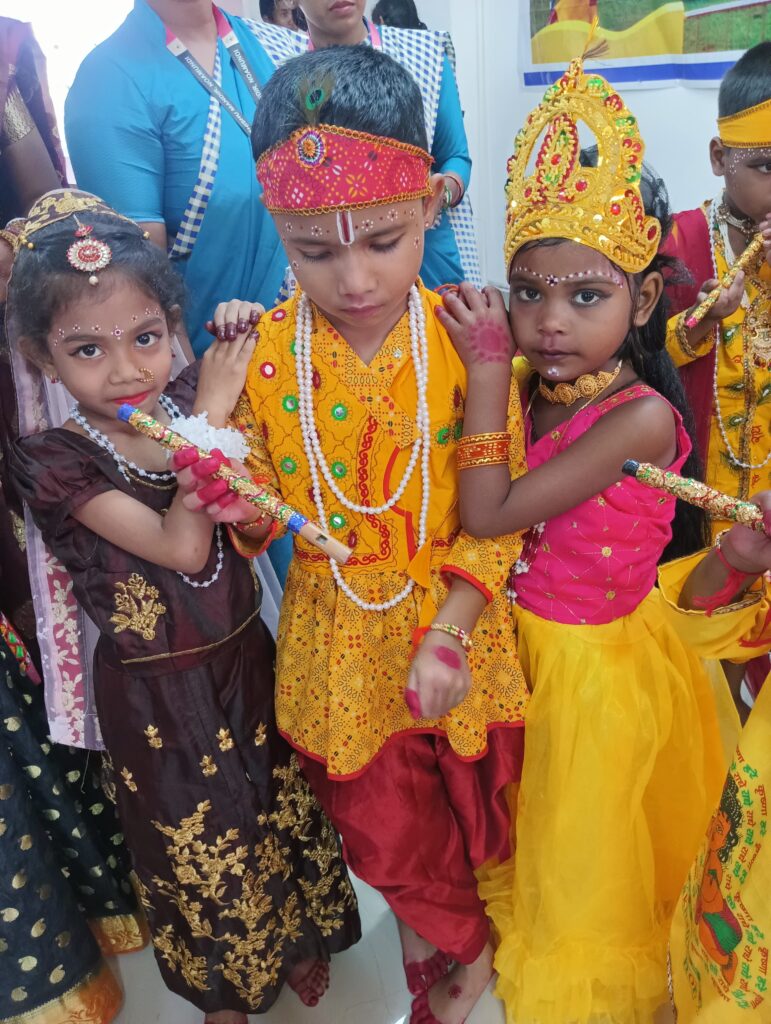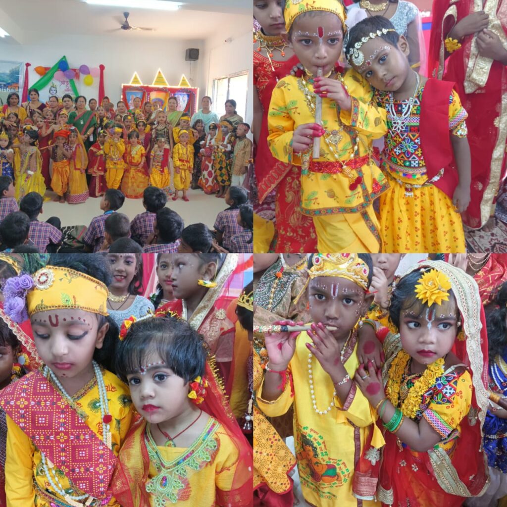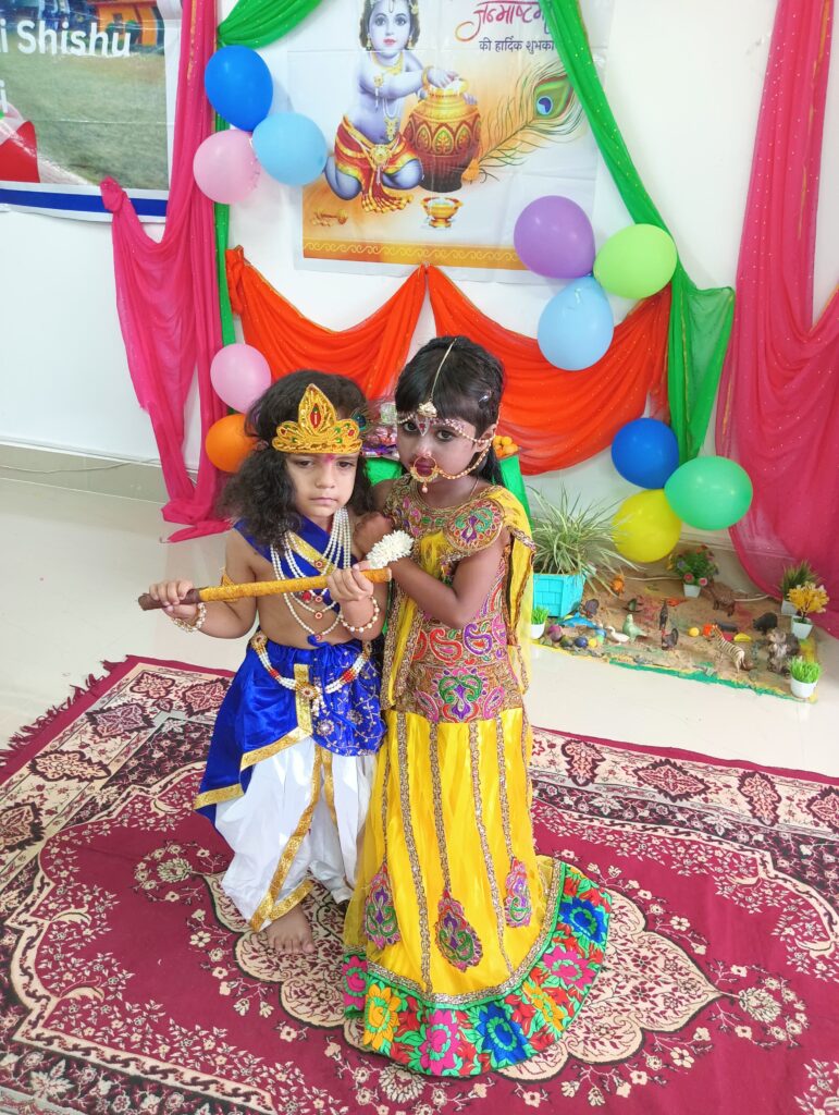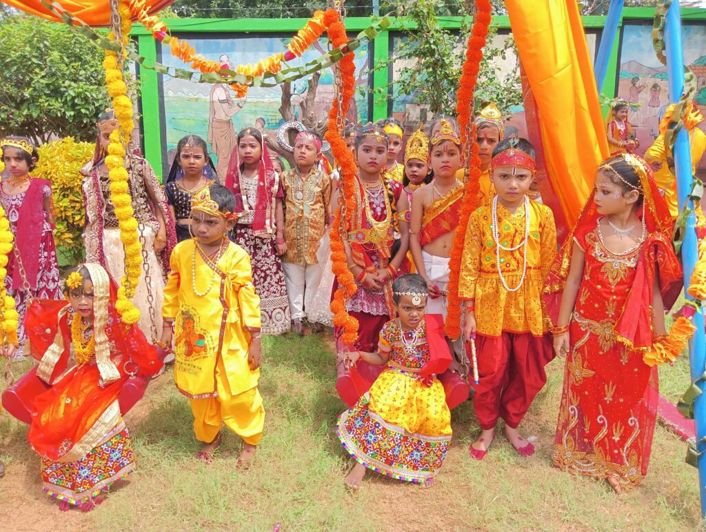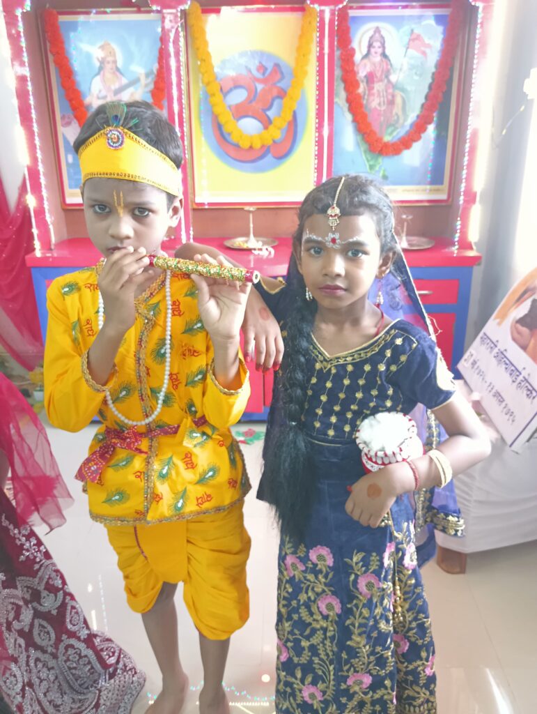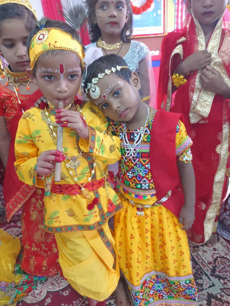 कक्षा अरुण से द्वितीय तक के भैया बहनों ने बाल गोपाल, राधा रानी और माता यशोदा की सुंदर झांकी प्रस्तुत की।