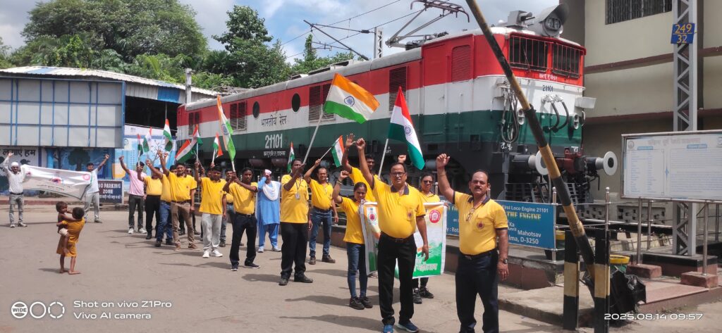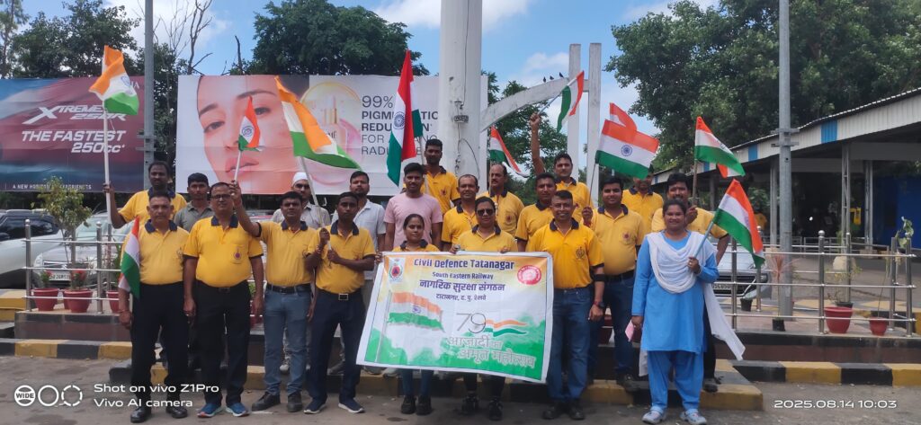 टाटानगर रेल सिविल डिफेंस जवानो ने 79 वे स्वतंत्रता दिवस के अवसर पर हर घर तिरंगा, भारत माता की जय ,वंदे मातरम उद्घोषणा के साथ तिरंगा यात्रा निकाली निकाली । जिसका नेतृत्व सिविल डिफेंस इंस्पेक्टर संतोष कुमार ने किया ।