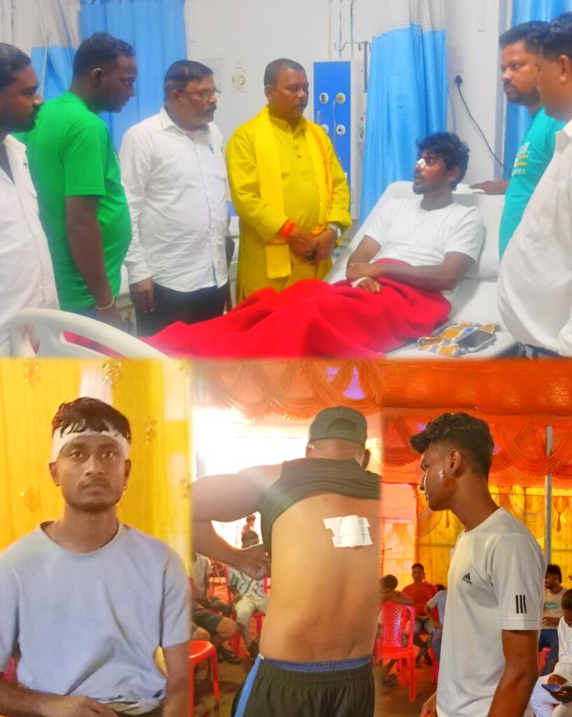 चक्रधरपुर : दुर्गा प्रतिमा विसर्जन के दौरान मुखी समाज के युवाओं को सितला मंदिर पुजा समिति में शामिल अपराधिक प्रवृत्ति के लोगों द्वारा धारदार हथियार से लैस होकर मुखी समाज के युवाओं पर कातिलाना और जानलेवा हमला किया जिसमें चार युवक बुरी तरह ज़ख़्मी हालत में है एक युवक रिकी मुखी रेल अस्पताल के आईसीयू में भर्ती जबकि अतुल मुखी, गोविंदा मुखी, दिनेश मुखी इलाजरत इस संदर्भ में मुखी समाज केन्द्रीय प्रतिनिधिमंडल एवं अनुसूचित जाति जिला अध्यक्ष जमशेदपुर के परेश मुखी के नेतृत्व में चक्रधरपुर पंहुचे ,