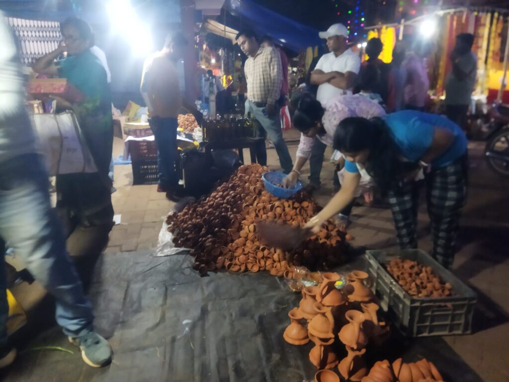 धनतेरस को लेकर पुराना नोवा मुंडी बाजार रंग बिरंगी झालर लाईट से सज गया है,मिट्टी के दिये और कलश लेकर कुम्हार बाजार पहुँचे हुए है,