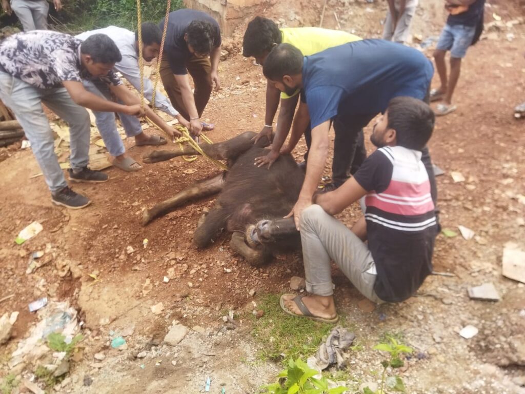 कब्रिस्तान के निकट एक अधूरे शौचालय के सेफ्टी टैंक का ढक्कन खुला हुआ था और भैंसी का बच्चा चरते चरते अचानक से उस गड्ढे से अंदर गिर पड़ा। वह तो भला हो छोटे बच्चों का जो खेलते खेलते उनकी नजर उस भैंस के बच्चे में पड़ गई तो उन्होंने लोगों को सूचना दी और खबर विश्व हिंदू परिषद के निलेश ठक्कर तक पहुंचा। तुरंत सक्रिय होकर विश्व हिंदू परिषद एवं बजरंग दल के कार्यकर्ता उस स्थान पर पहुंचे