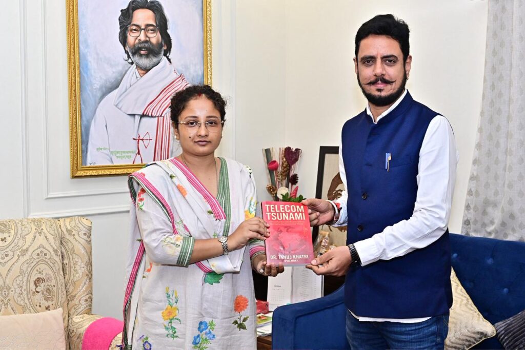 आज कांके रोड, रांची स्थित आवास पर झारखंड मुक्ति मोर्चा की माननीय विधायक श्रीमती कल्पना सोरेन जी को पार्टी के केंद्रीय सदस्य डॉ. तनुज खत्री ने अपनी नवप्रकाशित पुस्तक ‘टेलीकॉम सूनामी’ की प्रति भेंट की।इस अवसर पर श्रीमती कल्पना सोरेन ने डॉ. तनुज खत्री को उनकी नई पुस्तक के लिए बधाई और शुभकामनाएँ दीं।टेलीकॉम सूनामी’ पुस्तक भारत के दूरसंचार उद्योग की यात्रा, विकास, चुनौतियों और भविष्य पर आधारित है।