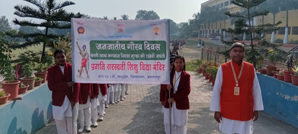 जमशेदपुर, 14 नवम्बर। बिरसानगर स्थित प्रगति सरस्वती शिशु विद्या मंदिर में शुक्रवार को जनजातीय गौरव दिवस एवं भगवान बिरसा मुंडा जयंती उत्साहपूर्वक मनाई गई। कार्यक्रम की शुरुआत विद्यार्थियों द्वारा निकाली गई रैली और झांकी से हुई, जिसके पश्चात संडे मार्केट स्थित भगवान बिरसा मुंडा की प्रतिमा पर माल्यार्पण किया गया। इस दौरान बिरसा सेवा दल ने बच्चों को चॉकलेट वितरित की।