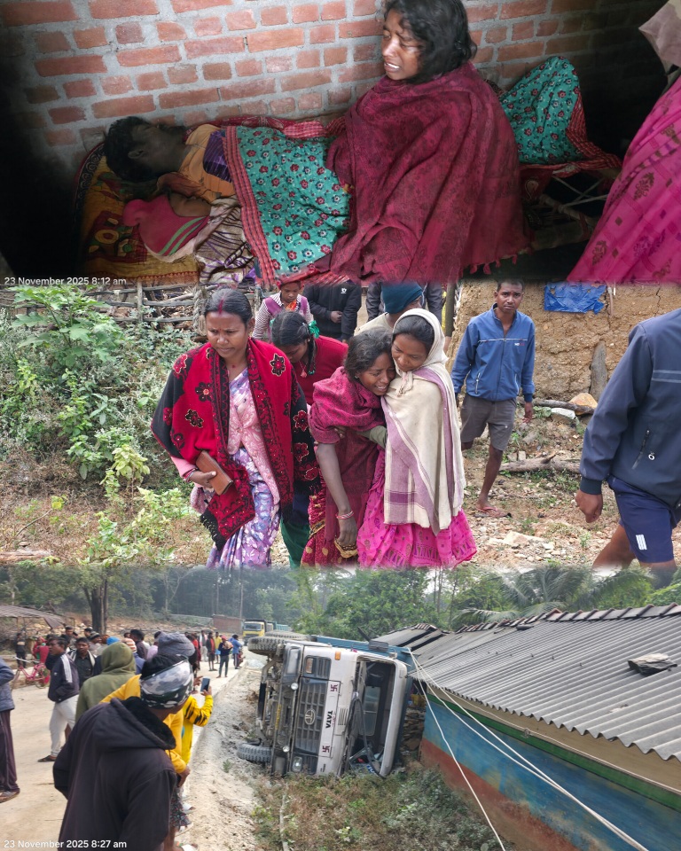 सड़क निर्माण के नाम पर फैली अव्यवस्था और बेतहाशा लापरवाही ने रविवार सुबह एक परिवार की खुशियाँ छीन लीं। हांडीभागा से सुदूर क्षेत्रों तक सड़क निर्माण कार्य कर रही लीडिंग कंस्ट्रक्शन कंपनी की गिट्टी लदी एक तेज रफ्तार हाईवा सुबह करीब 4:30 बजे पालोबेड़ा के पास अनियंत्रित होकर पलट गई। हादसा इतना भयावह था कि भारी वाहन सड़क किनारे बने एक घर पर जा गिरा, जिसमें सो रहे 30 वर्षीय बीरबल मुर्मू और उनकी डेढ़ वर्षीय बेटी अनुश्री मुर्मू की मलबे में दबकर दर्दनाक मौत हो गई। बीरबल की पत्नी गंभीर रूप से घायल हैं, जिन्हें कांड्रा थाना पुलिस ने तुरंत अस्पताल भेजा।