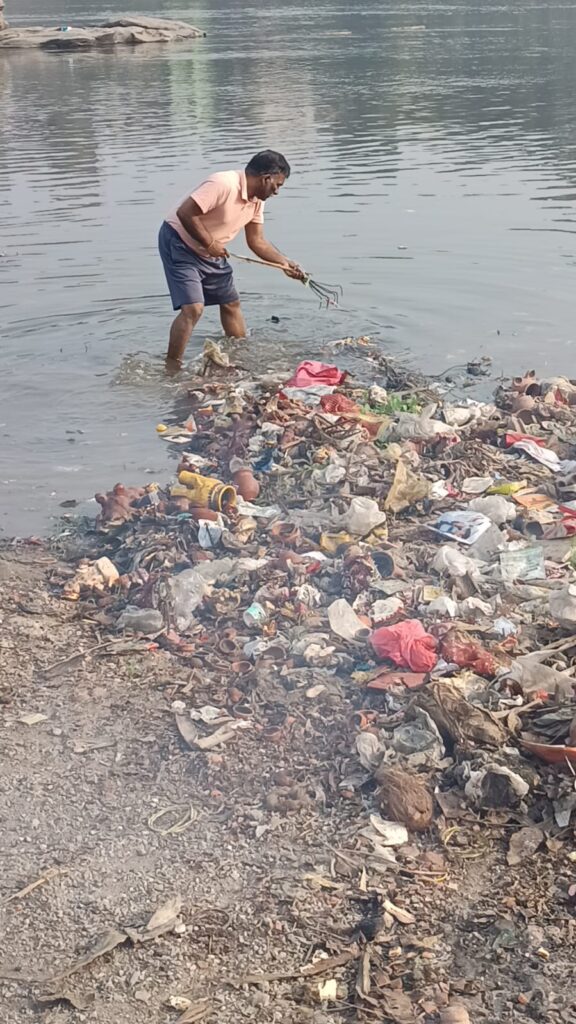 जमशेदपुर । अखिल भारतीय पूर्व सैनिक सेवा परिषद एवं राष्ट्रीय चेतना संस्थान ने गांधी घाट में चलाया सफाई अभियान। महापर्व की समापन के बाद सफाई का बीड़ा उठाते हुए संस्थान के सदस्य गांधी घाट पर एकत्रित हो सफाई अभियान चलाया। सर्वप्रथम वहां विसर्जित किए गए मूर्तियां से शुरुआत की गई। प्रतिमाओं के गहने और प्लास्टिक को हटा दिया गया, उसके बाद किसी तालाब में प्रवाहित किया, ताकि फिर से तालाब की सफाई हो जाए।श्री किशोर कुमार सदस्य अखिल भारतीय पूर्व सैनिक सेवा परिषद का संदेश -हमारे पूर्व सैनिकों ने अपना पूरा जीवन देश की सीमाओं की रक्षा में समर्पित कर दिया। उन्होंने कठोर परिस्थितियों में रहकर, अपने परिवारों से दूर रहकर, और कई बार अपने प्राणों की आहुति देकर भी राष्ट्र की सेवा की। आज जब वे सेवानिवृत्त हो चुके हैं, तो उनका कर्तव्य समाप्त नहीं हुआ है – बल्कि एक नया अध्याय शुरू हुआ है। आज हमारा देश एक नई लड़ाई लड़ रहा है – प्रदूषण, गंदगी और पर्यावरण विनाश के खिलाफ।श्री वरुण कुमार संस्थापक अखिल भारतीय पूर्व सैनिक सेवा परिषद गांधी घाट पर हम जो सफाई अभियान चला रहे हैं, वह केवल कचरा उठाने का कार्य नहीं है। यह राष्ट्र निर्माण का एक पवित्र कार्य है। यह हमारी आने वाली पीढ़ियों के प्रति हमारी जिम्मेदारी है। यह हमारी संस्कृति और परंपराओं को बचाने का प्रयास है।मैं सभी नागरिकों से अपील करता हूं – चाहे आप युवा हों, बुजुर्ग हों, विद्यार्थी हों या गृहिणी – इस अभियान में बढ़-चढ़कर हिस्सा लें। अपने बच्चों को भी साथ लाएं, ताकि उन्हें स्वच्छता और पर्यावरण संरक्षण के संस्कार मिलें। मिट्टी की मूर्तियों का उपयोग है lप्लास्टर ऑफ पेरिस (POP) की मूर्तियां पानी में घुलती नहीं हैं और जल प्रदूषण का कारण बनती हैं। इनमें प्रयोग किए जाने वाले रासायनिक रंग जलीय जीवों के लिए हानिकारक होते हैं।शुद्ध मिट्टी या चिकनी मिट्टी से बनी मूर्तियों का प्रयोग करेंlये मूर्तियां पानी में आसानी से घुल जाती हैं।मिट्टी जैविक तत्व है और पर्यावरण के लिए सुरक्षित है। स्थानीय कुम्हारों को प्रोत्साहन मिलता है और रोजगार बढ़ता हैlप्लास्टिक मुक्त उत्सव है। प्लास्टिक, पॉलिथीन, थर्मोकोल सैकड़ों वर्षों तक नष्ट नहीं होते और जल एवं मृदा प्रदूषण फैलाते हैं।कपड़े या जूट के थैलों का उपयोग करेंlपत्तों से बने दोने-पत्तल का प्रयोग करेंलकड़ी या बांस से बनी सजावट का उपयोग करेंकागज से बने उत्पादों का प्रयोग करेंlधातु के बर्तनों में प्रसाद वितरण करेंlस्थानीय रूप से उगाए गए प्राकृतिक फूलों का प्रयोग करें। विसर्जन के बाद फूलों को खाद में बदलेंlघरेलू विसर्जन हैlबड़े टब या कृत्रिम तालाब में घर पर ही विसर्जन करें। पानी को बाद में पौधों में डालेंlसार्वजनिक ज