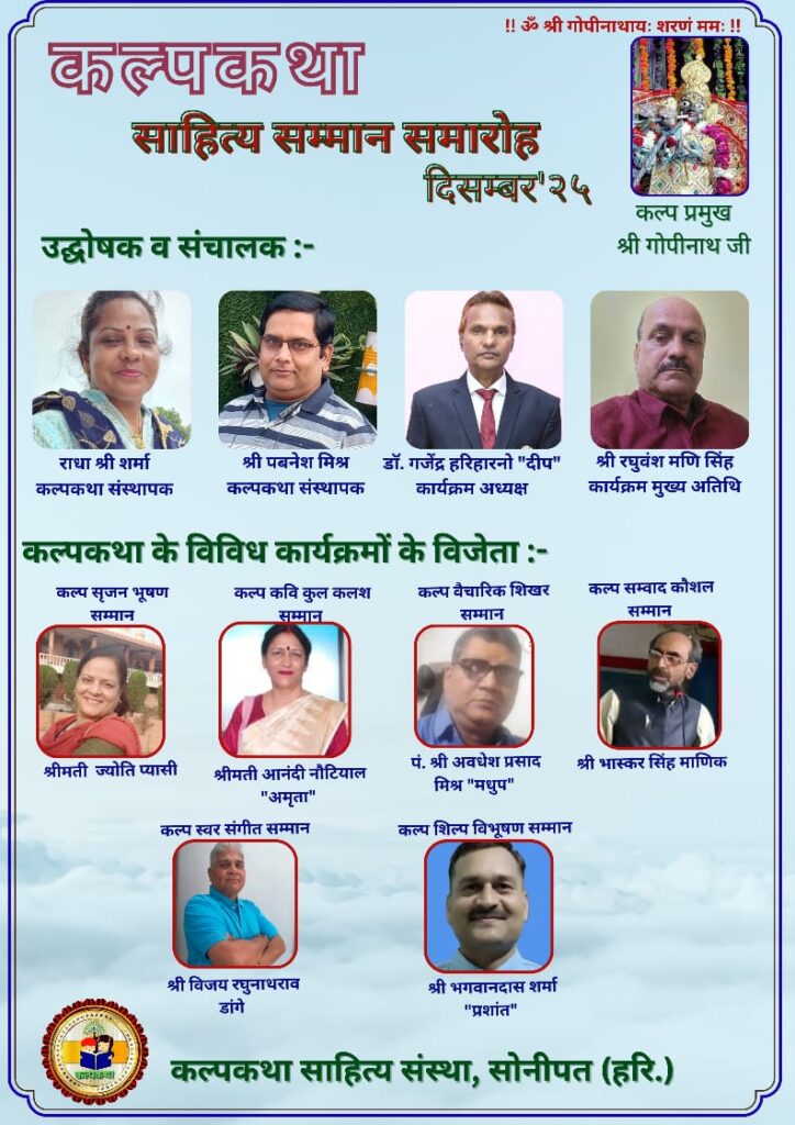 प्रभु श्री राधा गोपीनाथ जी महाराज की कृपा से संचालित कल्पकथा साहित्य संस्था परिवार की संवाद प्रभारी ज्योति राघव सिंह ने बताया कि दिसंबर २o२५ मासिक सम्मान समारोह में कल्पकथा परिवार ने विविध विधाओं में विद्वान रचनाकारों को सम्मानित किया।
