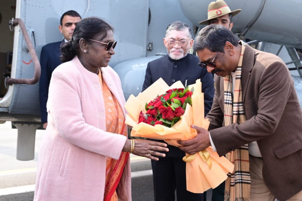 जमशेदपुर: आज सुबह सोनारी एयरपोर्ट पर मुख्यमंत्री श्री हेमन्त सोरेन ने राष्ट्रपति श्रीमती द्रौपदी मुर्मु का जोरदार स्वागत किया। राष्ट्रपति द्रौपदी मुर्मु आज जमशेदपुर के एक दिवसीय दौरे पर हैं, जहां वे कई महत्वपूर्ण कार्यक्रमों में भाग लेंगी राष्ट्रपति का हेलीकॉप्टर सुबह 10:20 बजे सोनारी एयरपोर्ट पर लैंड हुआ, जहां मुख्यमंत्री हेमन्त सोरेन ने उनका अभिनंदन किया। इस अवसर पर राज्यपाल संतोष कुमार गंगवार भी मौजूद थे। राष्ट्रपति के आगमन को देखते हुए सुरक्षा व्यवस्था के पुख्ता इंतजाम किए गए हैं राष्ट्रपति के कार्यक्रम में शामिल होने के लिए मुख्यमंत्री हेमन्त सोरेन एक दिन पूर्व ही जमशेदपुर पहुंच गए थे। राष्ट्रपति आज करनडीह स्थित दिशोम जाहेरथान में आयोजित ओलचिकी लिपि के शताब्दी वर्ष समारोह में भाग लेंगी और आदित्यपुर स्थित एनआईटी के दीक्षांत समारोह में मुख्य अतिथि के रूप में शामिल होंगी