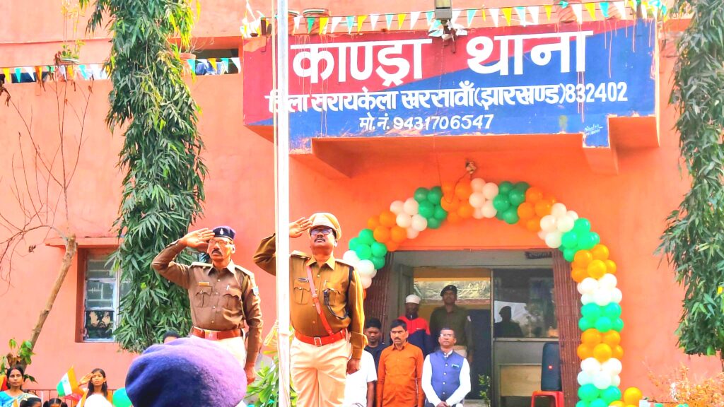 सरायकेला जिले के कांड्रा थाना परिसर में 77वां गणतंत्र दिवस श्रद्धा, गरिमा और उल्लास के साथ मनाया गया। इस अवसर पर थाना प्रभारी विनोद कुमार मुर्मू ने देश के शहीदों एवं महापुरुषों के चित्रों पर पुष्प माला अर्पित कर पूरे सम्मान के साथ तिरंगे का झंडोत्तोलन किया और राष्ट्रगान के साथ झंडे को सलामी दी।