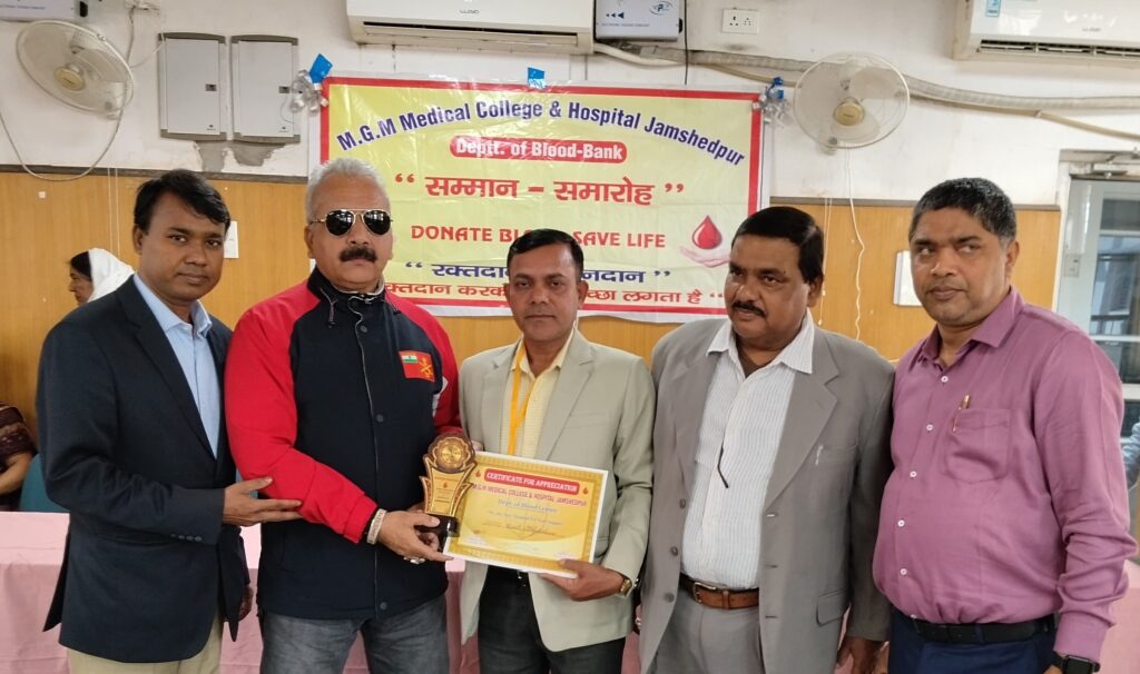 जमशेदपुर. एमजीएम अस्पताल स्थित ब्लड बैंक की ओर से गुरुवार को नियमित रूप से रक्तदान शिविर लगाने वाली 60 संस्थाओं को r सम्मानित किया गया. कार्यक्रम में मुख्य अतिथि एमजीएम मेडिकल कॉलेज के प्रिंसिपल डॉ. संजय कुमार व विशिष्ट अतिथि उपाधीक्षक डॉ. नकुल प्रसाद चौधरी ने इन संस्थाओं के सामाजिक योगदान की सराहना की और उन्हें प्रशस्ति पत्र सौंपे. डॉ. संजय कुमार ने रक्तदान को महादान बताते कहा कि इन संगठनों की सक्रियता से ही जरूरतमंद मरीजों को समय पर रक्त उपलब्ध हो पा रहा है.