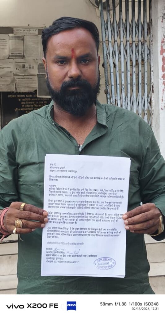 भाजपा नेता हरजीत सिंह उर्फ चिंटू सिंह ने लिखित शिकायत साइबर अपराध थाना जमशेदपुर में करते हुए आरोप लगाया है कि उनके खिलाफ सोशल मीडिया पर एक सुनियोजित षड्यंत्र रचा जा रहा है।