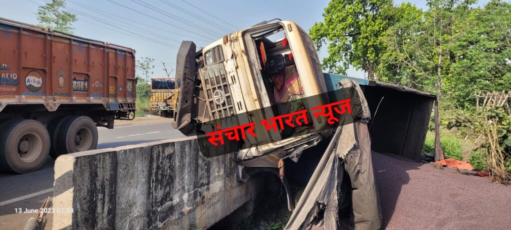 ठीक उसी समय एक टेलर उसी जगह खड़ी थी और अचानक टेलर के चालक ने टेलर को स्टार्ट कर के आगे बढ़ा दिया. हाईवा का चालक ट्रक, टेलर ओर बाइक को बचाने के लिए सड़क में बने छोटे पुलिया पे चढ़ गया. घटना बीते रात एक बजे की है .वहीं घटना के बाद चालक घटनास्थल से नौ दो ग्यारह हो गया.