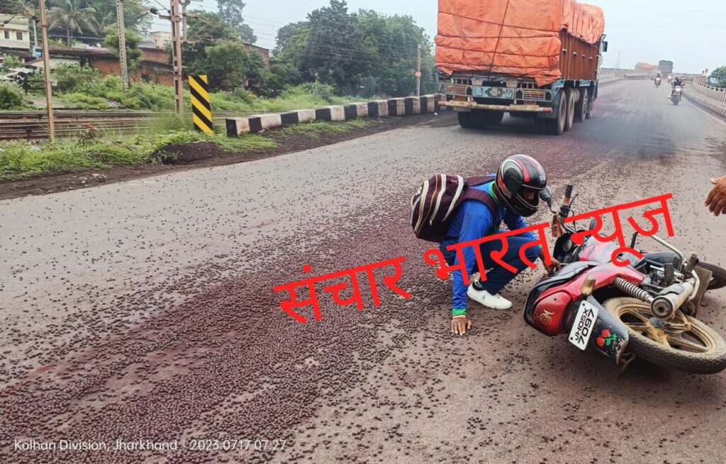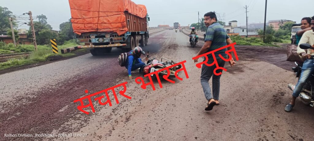 और आयरन पिलेट बीच सड़क पर गिर गया. उसी समय एक बाइक चालक कांड्रा से चांडिल की ओर जा रहा था. जैसे ही वह कांड्रा ओवर ब्रिज पहुंचा कि वह आयरन पिलेट से फिसल गया और बीच सड़क पर गिर गया.हालांकि , बाइक चालक को ज्यादा चोट नहीं आई है .बताते चलें कि इस सड़क से होकर हज़ारो की संख्या में लोग सड़क से होकर गुजरतें है.